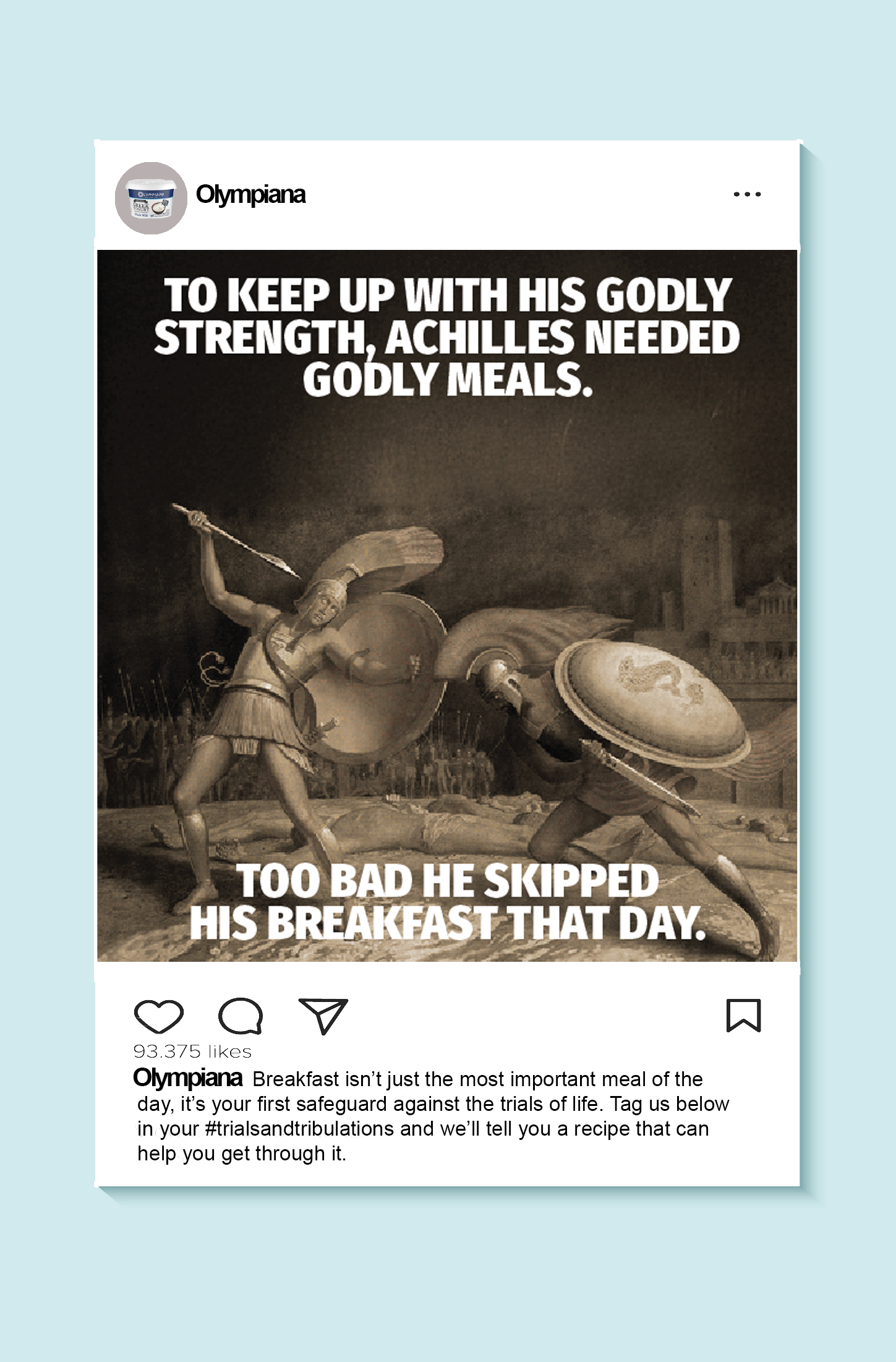 Breakfast is the most important meal of the day, but more often than not breakfast foods are unhealthy and bland. People who want healthier options are often forced to cook their own food each morning, which can be expensive and time-consuming. High-protein and portable Olympiana Yogurt is the perfect solution for anyone who needs the strength of the gods just to get through their day.